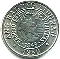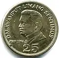 A second silver-colored coin featuring Luna was minted from 1975 to 1983. The name of the Republic was moved to the obverse. On the reverse read the inscription 'Ang Bagong Lipunan'. The issues from 1979 to 1982 featured a mintmark underneath the 25 centavo.
