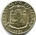 In 1969, the coin featured the Tagalog language for the first time. Its obverse featured Juan Luna, a Filipino painter, sculptor and a political activist of the Philippine Revolution during the late 19th century, in profile to the left. The inscription around the shield on its reverse read 'Republika ng Pilipinas'.