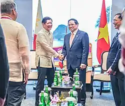 The Philippines and Vietnam have territorial disputes over the Spratly Islands, along with Brunei, China, Malaysia, and Taiwan. The Philippines and Vietnam both disapprove of China's nine-dash map which China uses as justification for its claim in the South China Sea.[23][24][25] Both countries were also committed to a multilateral diplomatic approach to the resolution of disputes in the South China Sea with the UNCLOS taken into account.[19]