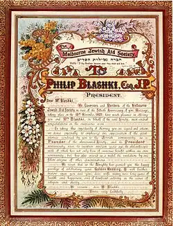 Blashki was particularly interested in advancing Jewish education.[15] He was first president of the Board of the East Melbourne Hebrew School. This became the United Jewish Education Board, with Victorian Attorney General Isaac Isaacs as its president and Phillip Blashki as its treasurer[13] and succeeding president.[12] He also acted as chairman to the Board of Advice to the Victorian Education Department for the East Melbourne District.[13]