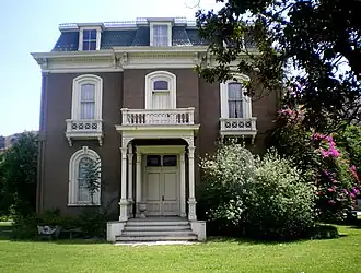 The Phillips Mansion was built in 1875 at a cost of over $20,000.[9] It has been described as having been built in the "Second Empire" or "Classic Haunted Mansion architectural style."[9] It was built with 16-foot (4.9 m) ceilings and six fireplaces.[9] The bricks were made at the site by Joseph Mullally of Los Angeles.[10] With its use of a mansard roof, some have described it as being "in the style of the New Orleans French homes."[11] Another writer noted that it "looks as if it had been lifted bodily from the tree-lined street of a midwestern county seat," the "kind of house the banker of such a town would build for himself."[10] The interior of the mansion is finished in cherry and maple wood that was hauled by horse and wagon from San Pedro.[12] The mansion represented a number of firsts in the Pomona Valley, including the following: