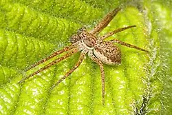 Philodromus dispar is a philodromid crab spider found on trees and bushes. It is an agile hunter. The female of the species is variable in size and colour. The male is shiny and iridescent black or dark brown with white edges.