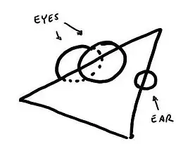All characters in Phineas and Ferb were drawn in a design borrowed from Tex Avery's style, with geometric shapes being included in their structure; Phineas in particular is that of a triangle.[1] The triangle face has been stated in the series as being just his nose that covers the entire head.[24] The goal while drawing characters was to make them simple enough to be drawn by child viewers and be recognized by silhouette.[20] Phineas's eyes lie on the top of his head[25] and are of oval shape.[26] For his hair, three "tufts" are put in the back and front, while three freckles lie underneath. For the ear, a small 3 is used to represent the ear lobe.[25][26] Povenmire uses thin, spindly arms for every character as a simple reason to add fun.[25]