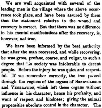 Phrenologists contended that destruction of the mental "organs" of Veneration and Benevolence caused Gage's behavioral changes. Harlow may have believed that the Organ of Comparison was damaged as well.