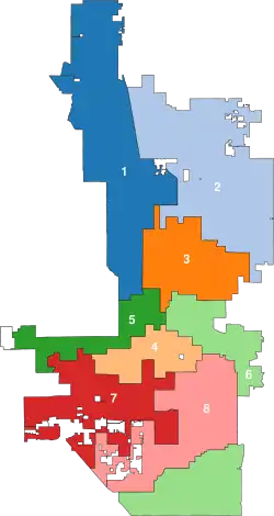 The Phoenix City Council is the governing body of the city of Phoenix, Arizona. The council is made up of nine members, including a mayor and eight council members representing individual districts. While the mayor is elected in a citywide election, city council members are elected by votes only in the districts they represent, with both the mayor and council members serving four year terms.[1]