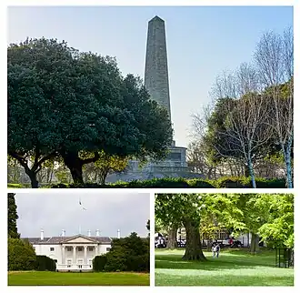 ![]() Clockwise from top: the Wellington Monument; gardens near the park's tea rooms; Áras an Uachtaráin, the residence of the president of Ireland | |