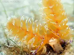 Phoronopsis californica lives in a stiff tube encrusted with sand and embedded in sandy or muddy sediment. The tube is up to 250 millimetres long, 3 millimetres wide at the open end and twice this diameter in the middle. There is a bulge at the other end, which is sealed. At the collar, just below the lophophore or feeding organ, the worm has the marked involution of the epidermis which distinguishes the genus Phoronopsis.[2] When the worm is extended it can reach 450 millimetres in length with a diameter of up to 5 millimetres. The colour varies but is usually orangish-brown with a red, orange or green lophophore. This organ has about 1,500 tentacles, each some 2.5 millimetres long, arranged in a pair of helicoid whorls with four to seven coils. These project from the seabed and are the only part of the animal normally visible. They can be retracted back into the tube if danger threatens or when the animal is no longer submerged.[3]