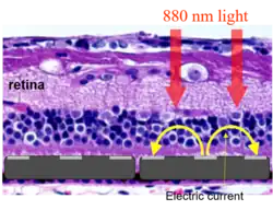 - ^ Wang, Lele; et al. (2012). "Photovoltaic retinal prosthesis: Implant fabrication and performance". Journal of Neural Engineering. 9 (4): 046014. Bibcode:2012JNEng...9d6014W. doi:10.1088/1741-2560/9/4/046014. PMC 3419261. PMID 22791690.