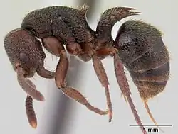 Phrynoponera bequaerti is an Afrotropical species of ant in the subfamily Ponerinae. The species is almost as common and widespread as Phrynoponera gabonensis and by far the smallest species in the genus. P. bequaerti is easily recognized by its size, lack of clypeal teeth and short, broad funicular segments. Unlike P. gabonensis and P. sveni, P. bequaerti has not been found in termitaries.[1]