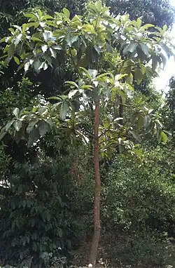 The Phulwara is a medium-size deciduous tree with a straight trunk. It typically attains a height of 15 to 22 meters and a girth of 1.5 to 1.8 meters. In the Andaman Islands it can reach a height of 21 to 36 meters and a girth of 1.5 to 2.4 meters. In the hills of Kumaun, the tree attains a girth of 3 meters. The bark is dark grey or brown.[1] The tree typically begins to yield fruits after five to nine years, reaching full potential in about fifteen years. It can yield fruits for fifty to sixty years.[2]