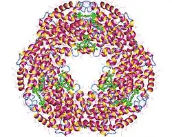 - ^ Camara-Artigas A, Bacarizo J, Andujar-Sanchez M, Ortiz-Salmeron E, Mesa-Valle C, Cuadri C, Martin-Garcia JM, Martinez-Rodriguez S, Mazzuca-Sobczuk T, Ibañez MJ, Allen JP (October 2012). "pH-dependent structural conformations of B-phycoerythrin from Porphyridium cruentum". The FEBS Journal. 279 (19): 3680–3691. doi:10.1111/j.1742-4658.2012.08730.x. PMID 22863205. S2CID 31253970. PDB ID: 3V57.