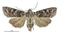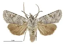Expanse. 28 to 30 lines. Antennae ferruginous-grey, filiform. Legs, palpi, head, and thorax grey irrorated with ferruginous. A dark mark across front of thoracic crest. Crests strong. Abdomen greyish-ochreous, lighter in colour towards anal tuft, which is light ochreous-grey. Forewings grey, markings ferruginous. Reniform and orbicular grey out-lined with ferruginous. Base of wing light grey, followed by a dark jagged transverse line. A double jagged transverse line at 1⁄4 across wing. A suffused patch around reniform, continuing as a well-defined jagged line with a faint line on each side to dorsum. A rather indistinct suffused line near termen. Cilia grey. Hindwings uniform dark-grey. Cilia silvery-grey with a dark-grey line at base.[2]