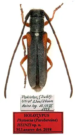 Holotype: Coll. Danilevsky. male, each with 2 labels: 1) “Pakistan (Swāt): Utrot 2300/2600 m / Heinz leg. / 15/19.VII.1997”; 2) “HOLOTYPUS / Phytoecia (Parobereina) / HEINZI sp.n. / M.Lazarev det. 2019”.