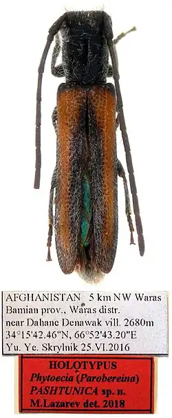 Holotype: Coll. Danilevsky. female, each with 2 labels: 1) “AFGANISTAN 5 km WS Waras / Bamian prov., Waras distr. / near Dahane Denawak vill. 2680 m / 34°15′42.46″N 66°52′43.20″E / 34.2617944°N 66.8786667°E / Yu.Ye. Skrylnik 25.VI.2016.”; 2) “HOLOTYPUS / Phytoecia (Parobereina) / PASHTUNICA sp.n. / M.Lazarev det. 2019”.