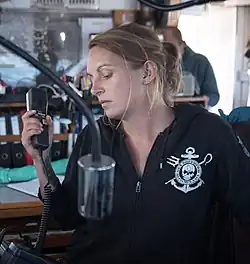 In 2011 she joined the marine conservation organization Sea Shepherd, working aboard MY Steve Irwin,[3][4] MY Bob Barker,[3][4] MY Sam Simon[4][2] and MV Brigitte Bardot,[4] for six years in various positions such as cook, rescue diver,[3] deckhand, ship manager[3] and second mate,[2] while gaining her sea captain's license. During this time she took part in many missions including Operation Relentless[4] and Operation Milagro.[3][4][5][6][7][8][9][2]