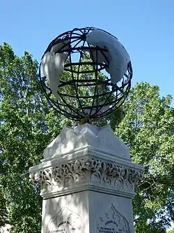 The use of the land around the cenotaph and memorial hall has changed over time. The last passenger service ran to Pialba station in 1972; the railway reserve was progressively subdivided from 1990; and train services were withdrawn from Pialba in January 1994.[22][23] The station master's house faced the sea at the north end of the yard (now the northwest corner of Freedom Park) until its removal c.1999.[24] By late 1998 the cenotaph had been moved 30 metres (98 ft) west, as Railway Square was landscaped as part of Freedom Park, which in 2016 covered 0.82 hectares (2.0 acres) of the former railway reserve, including the former railway station building and the memorial hall.[25][26] The railway station building was also moved westwards, and was rotated 180° to face the cenotaph, which was rededicated on 6 January 1999. A hollow metal world globe with laurel leaves at its base, designed and built by George Pujol, was added to the top of the marble pillar at this time.[1]