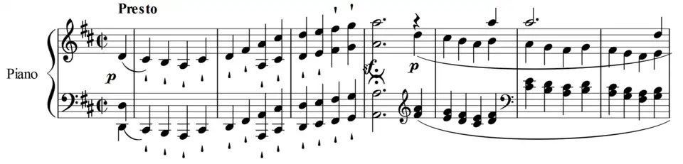 The third movement is in compound ternary form (minuet and trio). The minuet is in D major, the main key of the sonata and the trio is in the subdominant key of G major.[2]