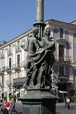 In the piazza are four lamp-posts, completed in 1957, in a program designed by Vincenzo Corsaro; each depicts a separate myth or legend linked to Catania sculpted in bronze by Mimì Maria Lazzaro and Domenico Tudisco. The lamp-posts suggest a candelabra, thus associated with a tradition of the candeloro displayed during the Festival di Sant'Agata. The four stories linked to the lamp-posts are: