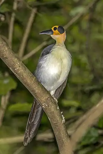 The picathartes, rockfowl, or bald crows are a small genus of two passerine bird species forming the family Picathartidae found in the rain-forests of tropical west and central Africa. They have unfeathered heads, and feed on insects and invertebrates picked from damp rocky areas. Both species are totally non-migratory, being dependent on a specialised rocky jungle habitat.[1] Both species are listed as vulnerable to extinction on the IUCN Red List.