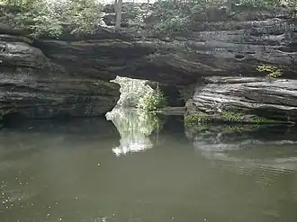 The park was developed by the Civilian Conservation Corps (CCC) between 1934 and 1942 on about 12,000 acres (49 km2) of land donated to the State of Tennessee in 1933 by the Stearns Coal and Lumber Company. CCC crews built hiking trails, a recreation lodge, a ranger station, five rustic cabins, and a 12-acre (4.9 ha) lake known as Arch Lake. Locally quarried sandstone was used in constructing most of the buildings. The original park facilities are listed on the National Register of Historic Places.[1] Pickett's land area has increased over time as a result of additional land donations and acquisitions,[4][5] and additional park facilities were built beginning in the 1950s.[2]