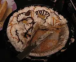 Butterscotch pie is made by cooking brown sugar with egg yolks, cornstarch, milk or cream and butter to make a butterscotch custard pie filling which is topped with meringue and browned in the oven.[15] Its invention is said to date back to 1904, credited to a creamery in Connersville, Indiana, where the recipe was published in the 1904 edition of a Methodist church cookbook.[16]