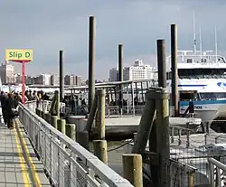 By the mid-1990s, Pier 11 was classified as being "structurally unsound";[46] the original pier was supported by wooden piles that were being damaged by marine borers.[47] The entire pier was demolished and rebuilt as a concrete structure to serve as a new ferry landing as part of a New York City Economic Development Corporation (NYCEDC)-led project that also included the development of an adjacent waterfront esplanade. Ferry operations were maintained at the site during the course of the four-year project, which spanned from 1996 through 2000.[47][48] Ferries began operating to the reconstructed pier in December 1999 and the new terminal building opened to the public in November 2000.[49]