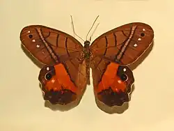 The basic colour of the wings is dark brown. The anterior wings have three black bands crossing the cell, the inner one prolonged to the inner margin. The end of the cell is also black. Two parallel black bands cross the wings from the inner margin to the costa. between these bands and the outer margin are a series of spots, the nearest the costa black, the next black and the two following white. The posterior wings have three black cross bands. Beyond the third of these bands is a large red patch. Beyond this patch the wings are darker and have a white spot and a black ocellus with the appearance of a pupil. The outer margin is deeply indented. The anal patch is dark brown.