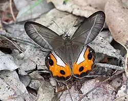 Underside: Palpi, legs, breast, and abdomen cream coloured. Anterior wings next the tips tinged with red brown; the remainder of the wings being of the same colour as on the upperside. Posterior wings next the body pale clay, which occupies half the wings; below which is a white bar, the remainder of the wings being dark orange: the two black eyespots are very small on this side, and the white spot above them not so distinct. These wings are larger than is generally observed among insects of this tribe, and are dentated, the anterior ones being entire. Wingspan 3 inches (76 mm).[3]