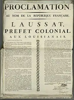 - ^ de Laussat, Pierre-Clément. "Proclamation. Au Nom de la République Française." (1803-03-27) [document]. France aux Amériques, File: FR ANOM C 13A 52 Fo 304. Paris, France: Archives nationales d'outre-mer, Bibliothèque nationale de France: Gallica.