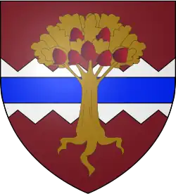 The shield shows an oak tree which refers to Duchesne's surname meaning "of the oak"; with the three roots symbolizing his children and the seven acorns symbolizing future descendants. The crane (grue) represents L'Isle-aux-Grues, Quebec, symbolizing Duchesne's attachment to that location and to Quebec as a whole, and holds a paint brush symbolizing Duchesne's support for the arts. The horizontal blue band represents the rule of law, alluding to Duchesne's previous roles as a notary and as Secretary General of the National Assembly, and the indented lines on the shield and rocky terrain of the supporters represent the Charlevoix region.[5]