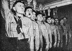 Labeling themselves the "successors of those of 1934" and targeting young people in their recruitment,[6] Jeune Nation was joined in 1956 by Dominique Venner, then 21, who would later oppose Sidos and mark a shift between his euro-nationalist doctrine and the "nostalgic neo-Petainists of Pierre Sidos."[7] Although they were largely inspired by the ideologies of fascist Italy and Vichy France,[8] Jeune Nation began to break with the collaborationist circles that had been protecting them since Sidos' prison time. As Gaullists and former resisters were joining their ranks during the Algerian war, Sidos furthermore banned any evocation of the period 1933–1945 among its militants, with only a few events like the commemorations of Robert Brasillach or 6 February 1934 allowed to take place.[4]