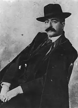 Pietro Gori was born on 14 August 1865, in the Sicilian city of Messina.[1] He was raised in Tuscany by a middle class family, which had participated in the Risorgimento. He was educated at a school in Livorno, before going on to study law at the University of Pisa. He graduated in 1889, after defending his thesis in which he argued that crime was caused by poverty.[2] During his studies, he had joined the Italian anarchist movement and began writing political tracts.[3] In 1890, he was arrested at an International Workers' Day demonstration in Livorno and imprisoned for a number of months.[3] After his release, he established himself as a criminal lawyer and defended several anarchist activists from prosecution. Through his work, he developed his skills as an orator, making him into a popular public speaker at political rallies.[4]