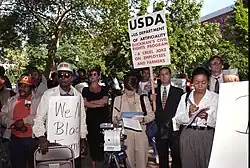Studies in the late 20th century found that county and state USDA authorities, who were typically white in the South, had historically and routinely discriminated against African-American farmers on the basis of race.[9] A USDA official might overtly deny an equipment loan, telling the black farmer that "all you need is a mule and a plow", or telling the black farmer that the disaster relief is "too much money for a nigger to receive."[10] But more often, the USDA used paper-shuffling, delaying loans for black farmers until the end of planting season, approving only a fraction of black farmers' loan requests, and denying crop-disaster payments for black farmers, which white farmers were routinely granted.[10]