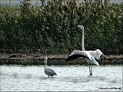 Regarding fauna, Pikrolimni is an important site for the breeding, passage and wintering of waterbirds as well as raptors, with more than 47 bird species listed in the Natura 2000 special protection area's data form.[5] Some representative avians that can be found in the lake biotope include the greater flamingo (Phoenicopterus roseus) in large flocks, Dalmatian pelican (Pelecanus crispus), great crested grebe (Podiceps cristatus), Eurasian curlew (Numenius arquata), little grebe (Tachybaptus ruficollis), merlin (Falco columbarius) and short-toed snake eagle (Circaetus gallicus).[4][5] Animals other than birds which can be found around the lake include reptiles, i.e. multiple species of toads, treefrogs and water snakes, or mammals such as the red fox (Vulpes vulpes), common weasel (Mustela nivalis) and even the endangered European ground squirrel (Spermophilus citellus).[4]