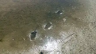 The physical and chemical properties of the black mud at the bottom of the lake have been also studied due to its application as a peloid.[7] The solid (dry) component is classified as sandy loam, containing on average 71% sand, 24% silt and 5% clay.[7] Chemically, the main component is silica, with additional major contributions from alumina, sodium chloride, iron(III) oxide, sulfate and carbonate salts.[8] These are found as minerals like quartz, clay minerals (mainly kaolinite with some montmorillonite and illite), halite, thenardite, burkeite, calcite, muscovite and albite.[7]