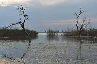 With respect to vegetation, the halophytes of the lake are both unusual and characteristic as the very different chemical composition of the water necessitates the differentiation from coastal halophytic growth.[3][4] The most notable halophytes of Pikrolimni are the alkali grass (Puccinellia convoluta), pricklegrass (Crypsis aculeata), herbaceous seablite (Suaeda maritima), (Camphorosma annua), buck's-horn plantain (Plantago coronopus), Siberian statice (Limonium gmelinii), sandspurry (Spergularia nicaeensis) and tall wheatgrass (Elymus elongatus).[3][4] These are accompanied by scattered reed bed formations of the common reed (Phragmites australis).[3]