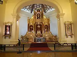 From 1812 to 1835 Filipino secular priests served as acting pastors of Pila due to a shortage of Franciscan priests.[2] These include Fray Lorenzo Samaniego (1812–1816); Pedro de los Santos (1816–1819); Pedro Alcántara (1819–1826); and Rudecindo Aquino (1826–1835).[4] The present church and convent was built in 1849 by Antonio Argobejo and Domingo de Valencia.[7] Both structure were badly damaged during the 1880 earthquake, in which the bell tower toppled. The bell tower was reconstructed by Damaso Bolanos and finished by Francisco de Santa Olalia, and again rebuilt by Lope Toledo.[9] The present rectory or convent (casa parroquial) is made of stone, constructed under the direction of Benito del Quintanar in the 1840s.[6]