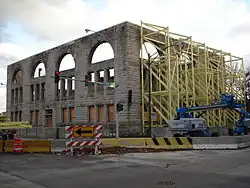 After the fire, the brick and stone of the outer walls still stood near-complete and were determined to be structurally sound. A steel support skeleton was later attached to the outside to brace the walls for a possible later reconstruction of the interior of the building and restoration of the façade.