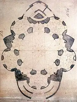 This is a good example of how Santini used to project his structures—practically just by using compass to draft whole building on arcs of circles which radius was generally multiple of building's module. In case of church of Saint John Nepomuk, Santini used number 5, Nepomuk's stars, number 3 which references to the Trinity, and number 6 which references to Saint Mary because John of Nepomuk was perceived as her adorer. Therefore, on the perimeter of church take turns five chapels with triangular ground plan and five with oval ground plan. At the same time the whole church resembles cut through choir of a Gothic cathedral and its buttress. The centrality of Nepomuk's church builds up a vertical as a symbolical phenomenon.[1] This very vertical tends to raise visitors look up to the symbolical heaven.