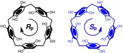 The orientation of the hydroquinone oxygens on both rims of the pillararene allow the macrocycle to exhibit planar chirality. When the substituent on the hydroquinone oxygen is small enough to fit through the cavity of the pillararene, allowing for oxygen-through-the-annulus rotation to occur, racemization occurs. If this substituent is large enough to prevent rotation, optically active pillararene macrocycles can be isolated.[7][8]