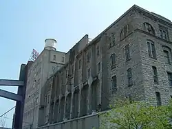The Pillsbury A-Mill is a former flour mill located on the east bank of the Mississippi River in Minneapolis, Minnesota. It was the world's largest flour mill for 40 years.[2][3] Completed in 1881, it was owned by the Pillsbury Company and operated two of the most powerful direct-drive waterwheels ever built, each capable of generating 1,200 horsepower (890 kilowatts). In 1901 one of the turbines was replaced with a 2,500 horsepower one. Both the mill and its headrace tunnel are contributing resources to the St. Anthony Falls Historic District, which is listed on the National Register of Historic Places. The mill is also independently on the NRHP. The mill was named a National Historic Landmark in 1966 and has since been converted into the A-Mill Artist Lofts.[4][5]
