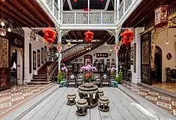The mansion contains thousands of Peranakan artifacts, antiques and collectibles, as well as showcasing Peranakan interior design and customs, such as the typical grand long dining table (Malay: tok panjang). Due to its unique architecture and interior design that reflect the lifestyles of the Peranakans in Penang, the mansion has been featured in television series and reality TV shows, such as The Little Nyonya, The Amazing Race and The Amazing Race Asia.[2][3]