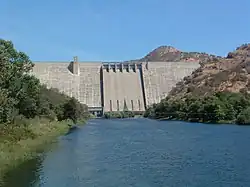 Pine Flat Dam is a concrete gravity dam on the Kings River in the Central Valley of Fresno County, California United States. Situated about 28 miles (45 km) east of Fresno, the dam is 440 feet (130 m) high and impounds Pine Flat Lake, in the foothills of the Sierra Nevada just outside the boundary of Kings Canyon National Park. The dam's primary purpose is flood control, with irrigation, hydroelectric power generation and recreation secondary in importance.