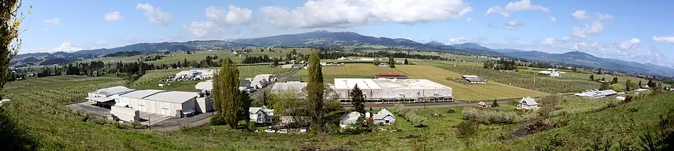Pine Grove was a station on the Mount Hood Railroad and was named for a stand of timber that once existed at this locale.[2] In 1886, German immigrant Peter Mohr planted 400 apple trees in the Pine Grove area, in what was probably the first commercial orchard in the Hood River Valley planted on dry land and relying solely on irrigation.[3] Pine Grove was also one of the primary communities in the Hood River Valley farmed by Nikkei—Japanese migrants and their descendants.[4]