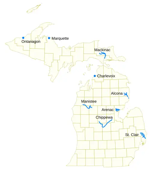 - Pine River (Mackinac County, Michigan) rises in Chippewa County and flows south through Mackinac County into the St. Martin Bay of Lake Huron at 46°03′09″N 84°39′22″W / 46.05250°N 84.65611°W[14] The North Pine River, also known as the North Branch Pine River, joins at 46°12′20″N 84°36′17″W / 46.20556°N 84.60472°W.[15] Another tributary, Hemlock Creek, is also known as Pine River.[16]