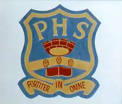 The badge includes the letters PHS (Pinetown High School), which are also used by its brother school, Pinetown Boys' High School, a crown which represents the period when South Africa was part of the British Empire, three pine cones honouring Sir Benjamin Pine, who was instrumental in developing Pinetown when it was still a village, and a book which stands for education.