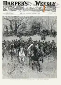 One band of Absentee Shawnee led by Big Jim (Wapameepto), grandson of Tecumseh, opposed absorption into white society for fear of losing their cultural traditions.[11] They had been living illegally north of the North Canadian River until November 1886 when soldiers from Fort Reno forced them to move south of the river to a place near Shawneetown. The soldiers burned their old houses and destroyed improvements they had made to the land so they could not return to their old homes. They wintered without shelter. Within three years they managed to build log houses and plant small fields and orchards amidst the White Turkeys, another band of Absentee Shawnees. By 1889 it was evident that the land they were now occupying would be broken up and sold.[12]