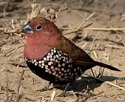The pink-throated twinspot (Hypargos margaritatus) is a small seed-eating bird in the family Estrildidae. It inhabits dry savanna and moist, subtropical/tropical (lowland) shrubland habitats near the southeast African coast in Mozambique, South Africa and Eswatini. It has a large range, with an estimated global extent of occurrence of 160,000 km2.[2]
