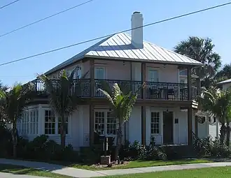 As the area developed, the house served as a hotel across from the Melbourne Beach Casino, which became a focal point for the town, and was used as the petty officers club for the Naval Air Station Melbourne during World War II.[11][9][12] The casino was built in 1924 on site of the town bathhouse.[13] In December 1925, at the intersection of Ocean Avenue and Atlantic Street, where the house is located, was site of the first recorded motor vehicle accident in the area as two Ford Model Ts collided.[13][14] The intersection was also the site of the town's second stop sign and at the time, and the road (now Florida State Road A1A) turned into a sand trail two blocks to the south.[14]