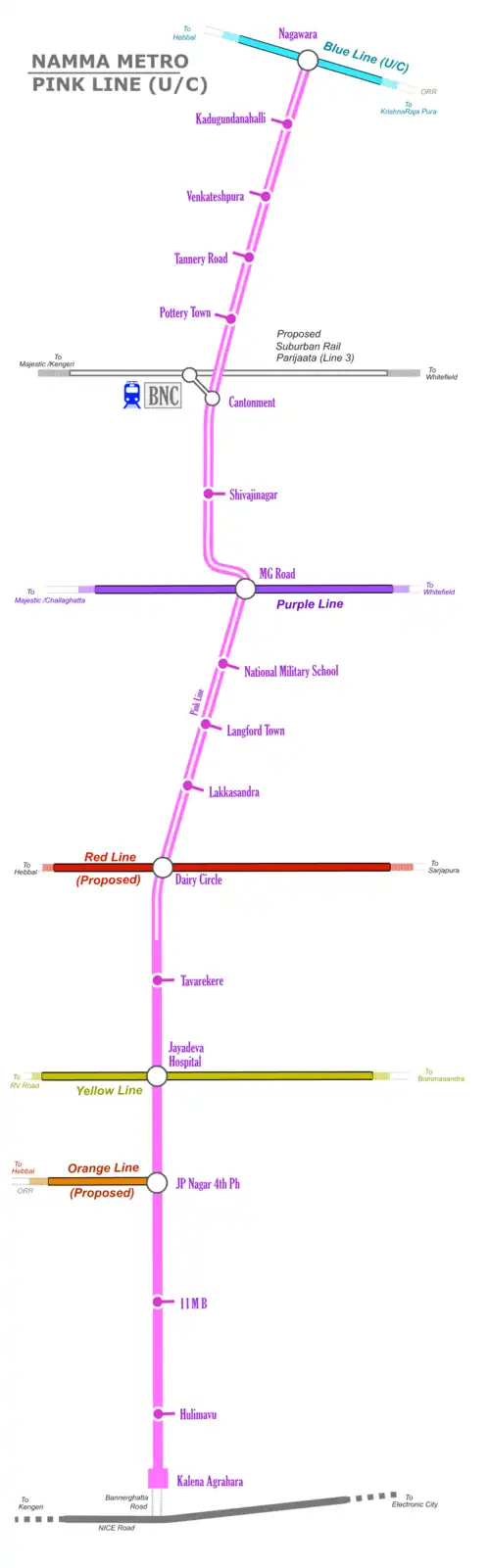 The Pink Line of Namma Metro is under construction and will form part of the metro rail network for the city of Bangalore, Karnataka, India. The 21.25 km (13.20 mi) line connects Kalena Agrahara station (previously named Gottigere) on Bannerghatta Road in the south with Nagawara station on Outer Ring Road in the north. The Pink Line is mostly underground (13.92 km (8.65 mi)) but also has a 6.98 km (4.34 mi) elevated section and a 0.48 km (0.30 mi) at-grade (surface) section. There are 18 stations on the line, including 12 underground and 6 elevated ones.[2] Pink Line will have an interchange with the Purple Line at MG Road station. It will also have interchanges with the Yellow line at Jayadeva Hospital station and with the Blue Line at Nagawara. The Blue Line is under construction.[3][4]